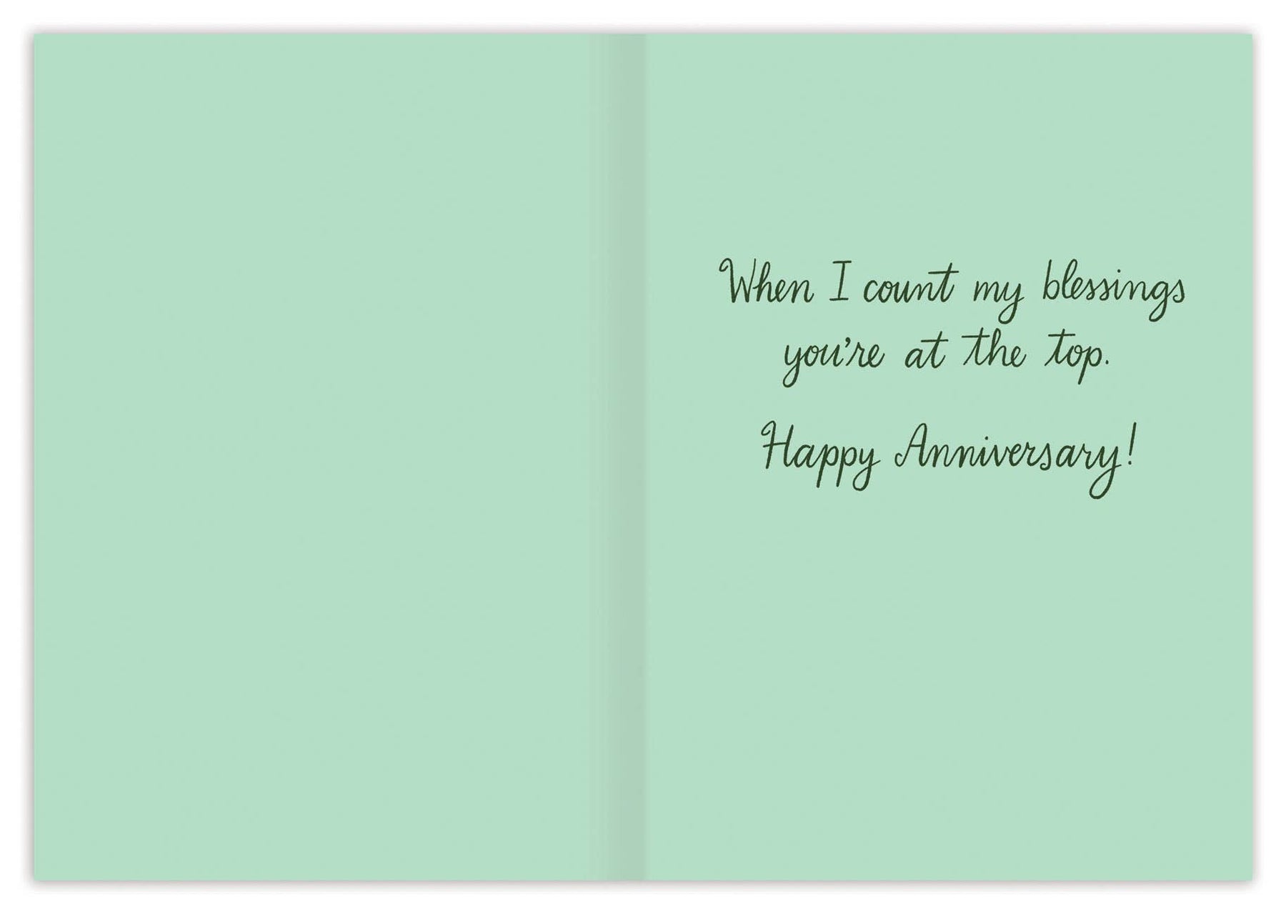 "How Did I Get So Lucky" Inside Verse: When I count my blessings you're at the top. Happy Anniversary! • Size: A6, 4.6" x 6.4" • Treatment: Gold foil • Illustrated by Carrie Shryock • Envelope color: White • Printed in the USA on high-quality recycled post-consumer waste paper