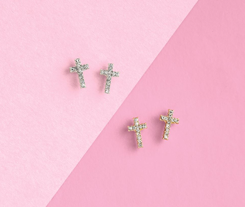 Delicate cross studs adorned with sparkling pavé detailing, perfect for everyday wear or special occasions. Safe and suitable for children ages 3 and up, these timeless pieces add a touch of grace to any look.