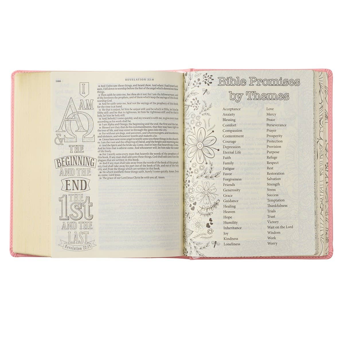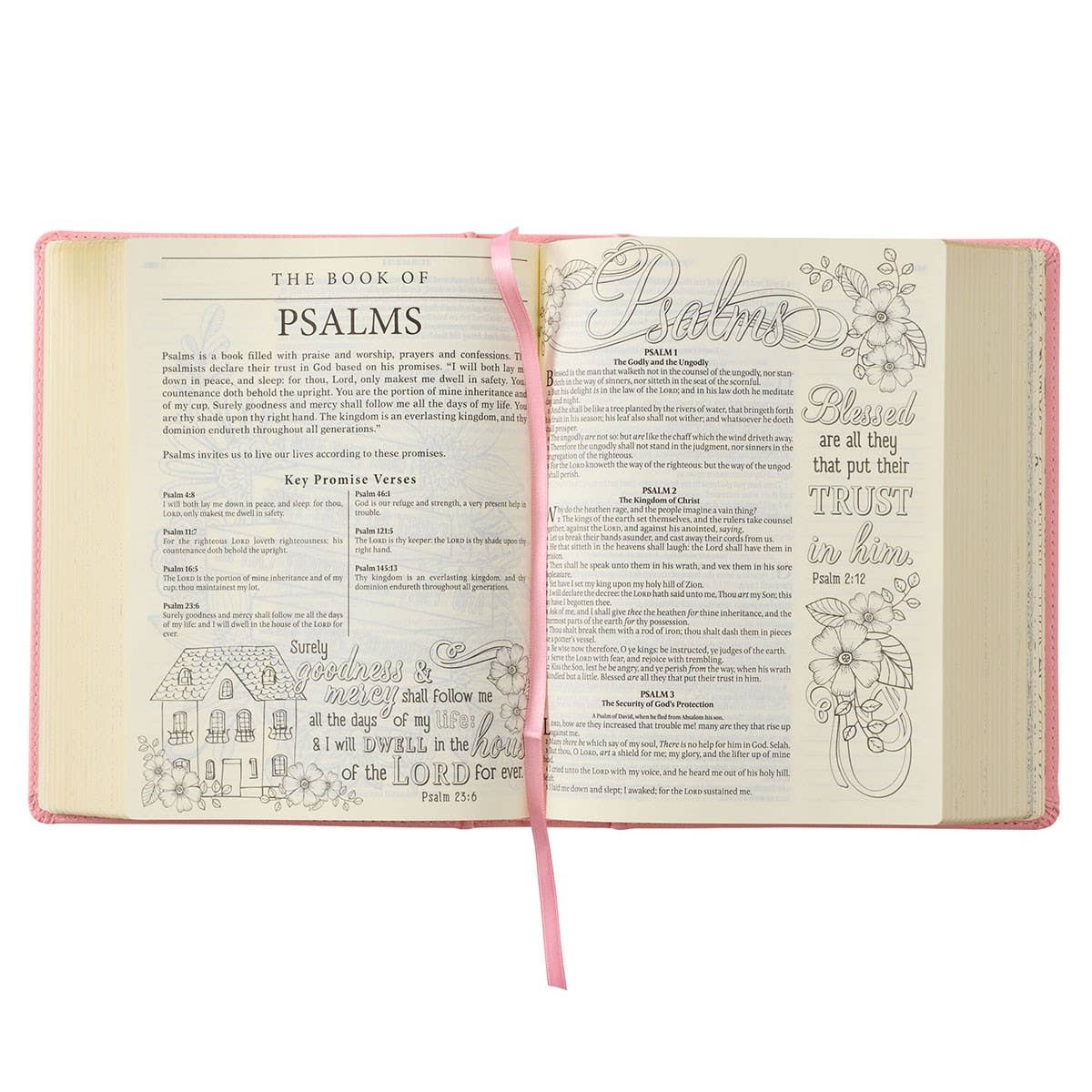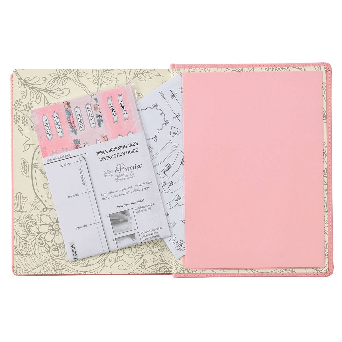 The Pink Hardcover Faux Leather KJV My Promise Bible is a visual reminder of God's promises and a way to express your faith through art. Document your faith journey through colorful notes, quotes, and illustrations when you work through this coloring Bible.