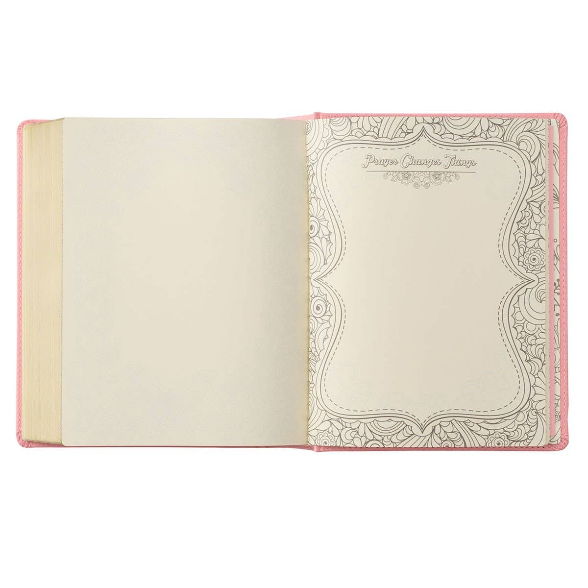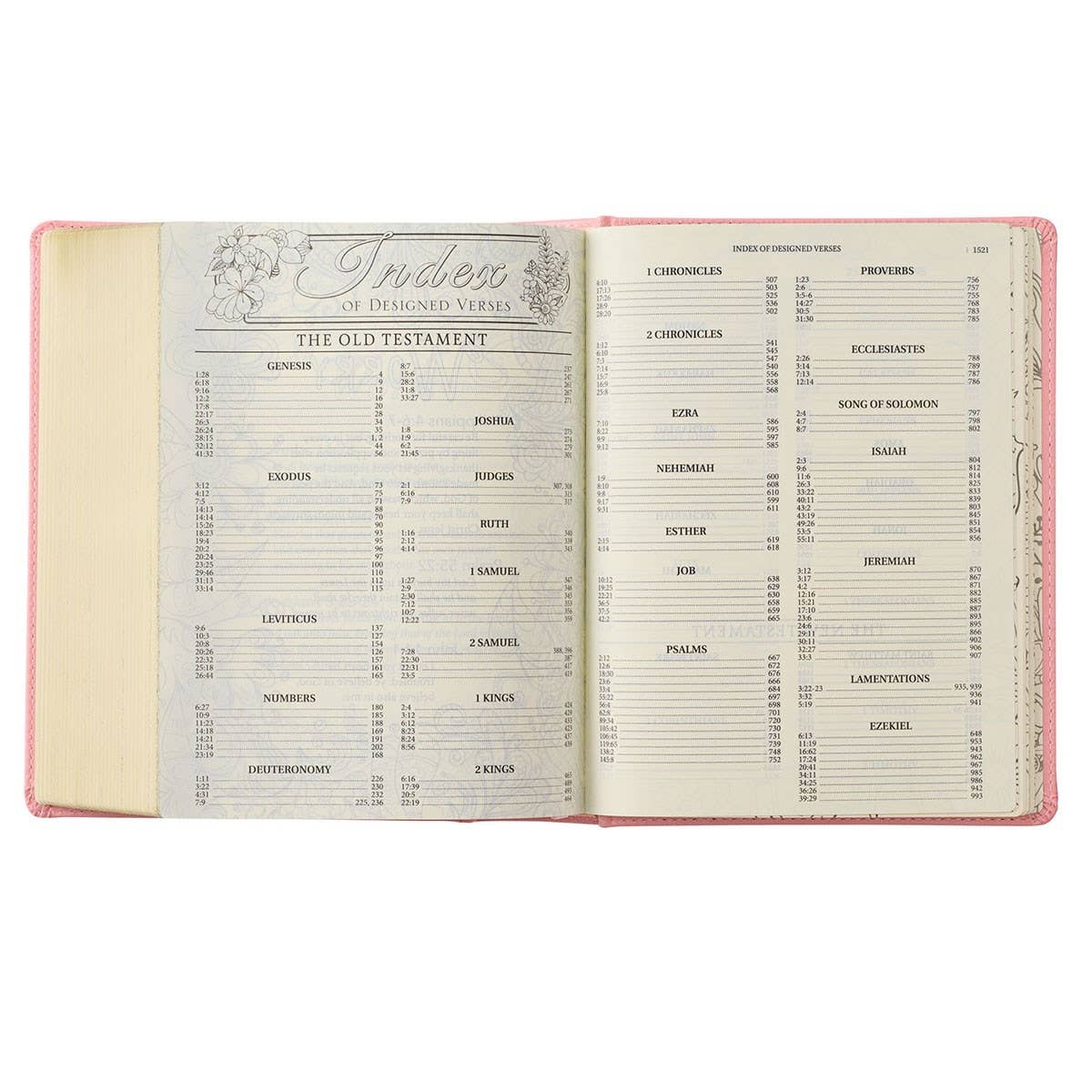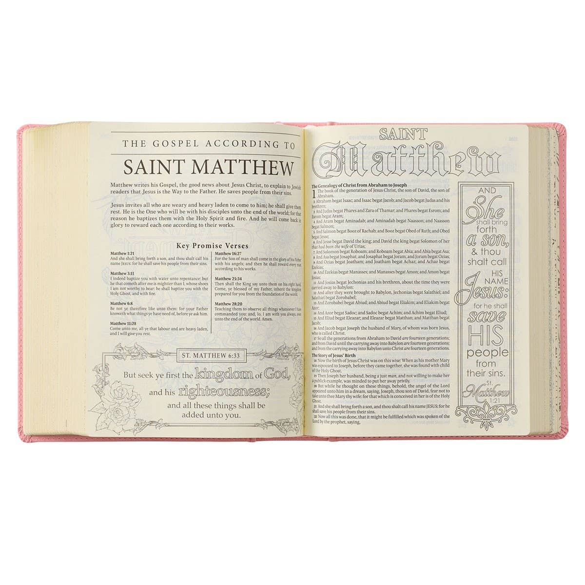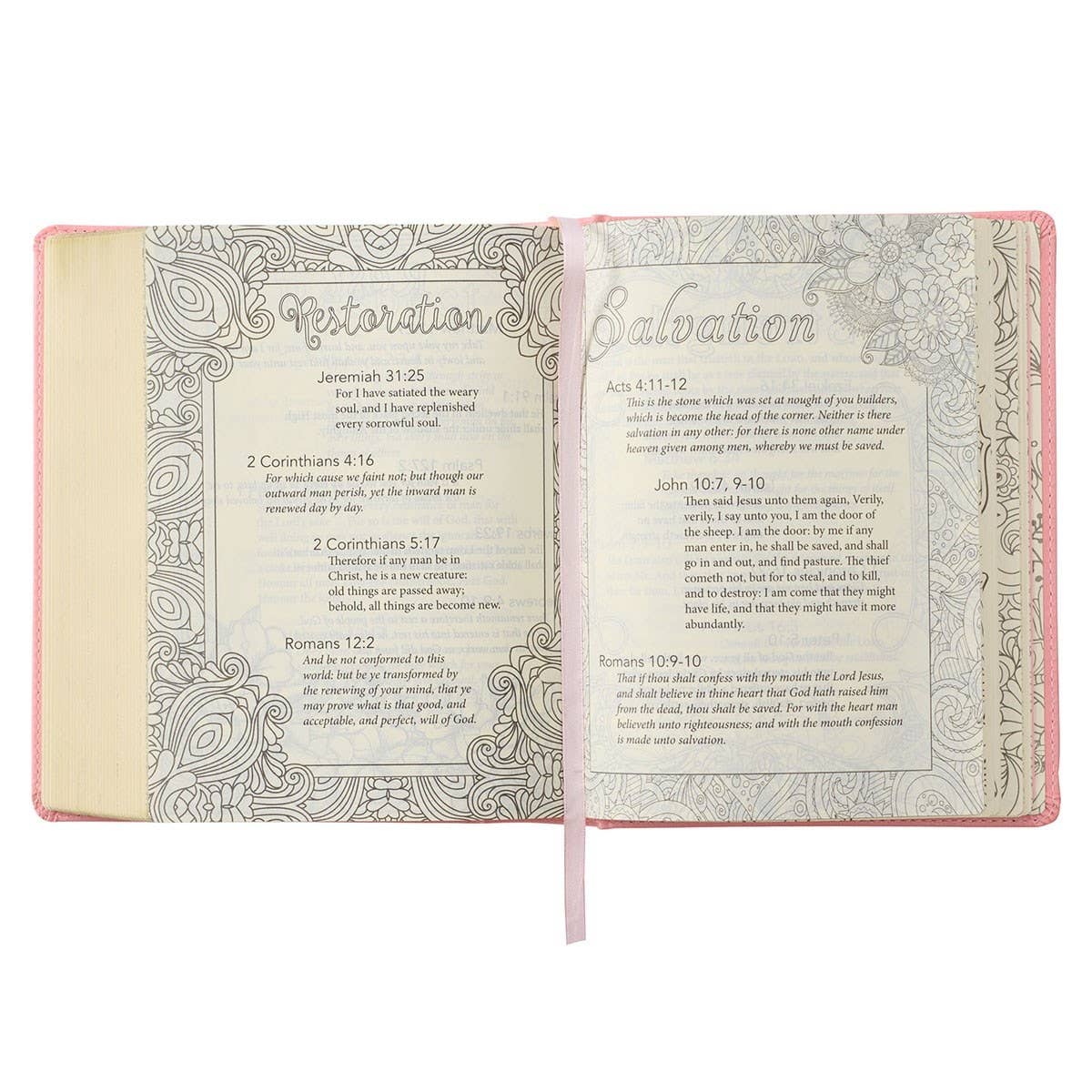 The Pink Hardcover Faux Leather KJV My Promise Bible is a visual reminder of God's promises and a way to express your faith through art. Document your faith journey through colorful notes, quotes, and illustrations when you work through this coloring Bible.