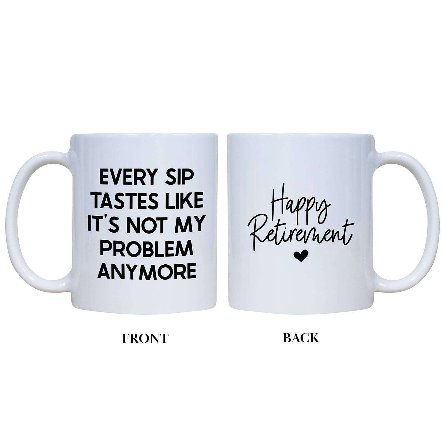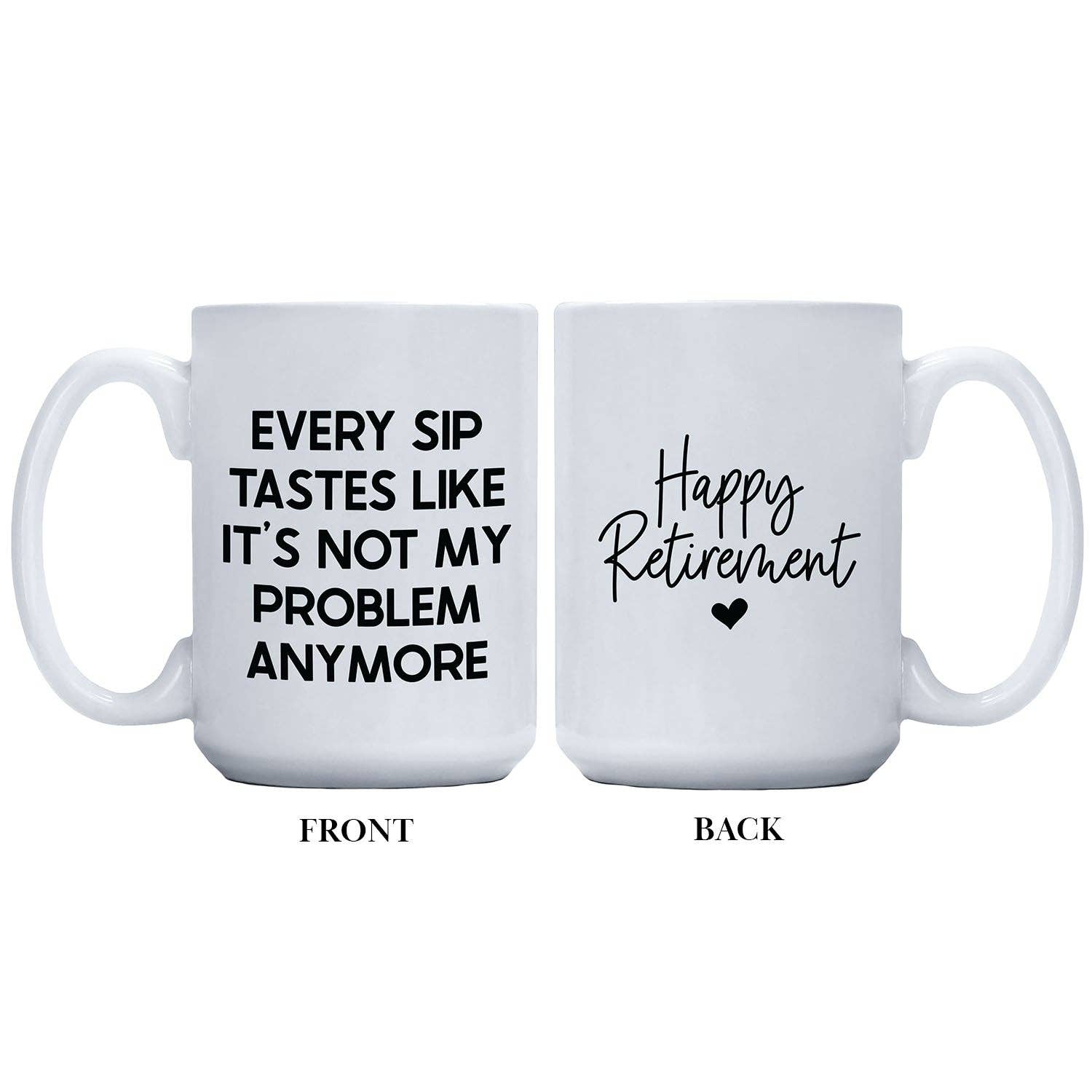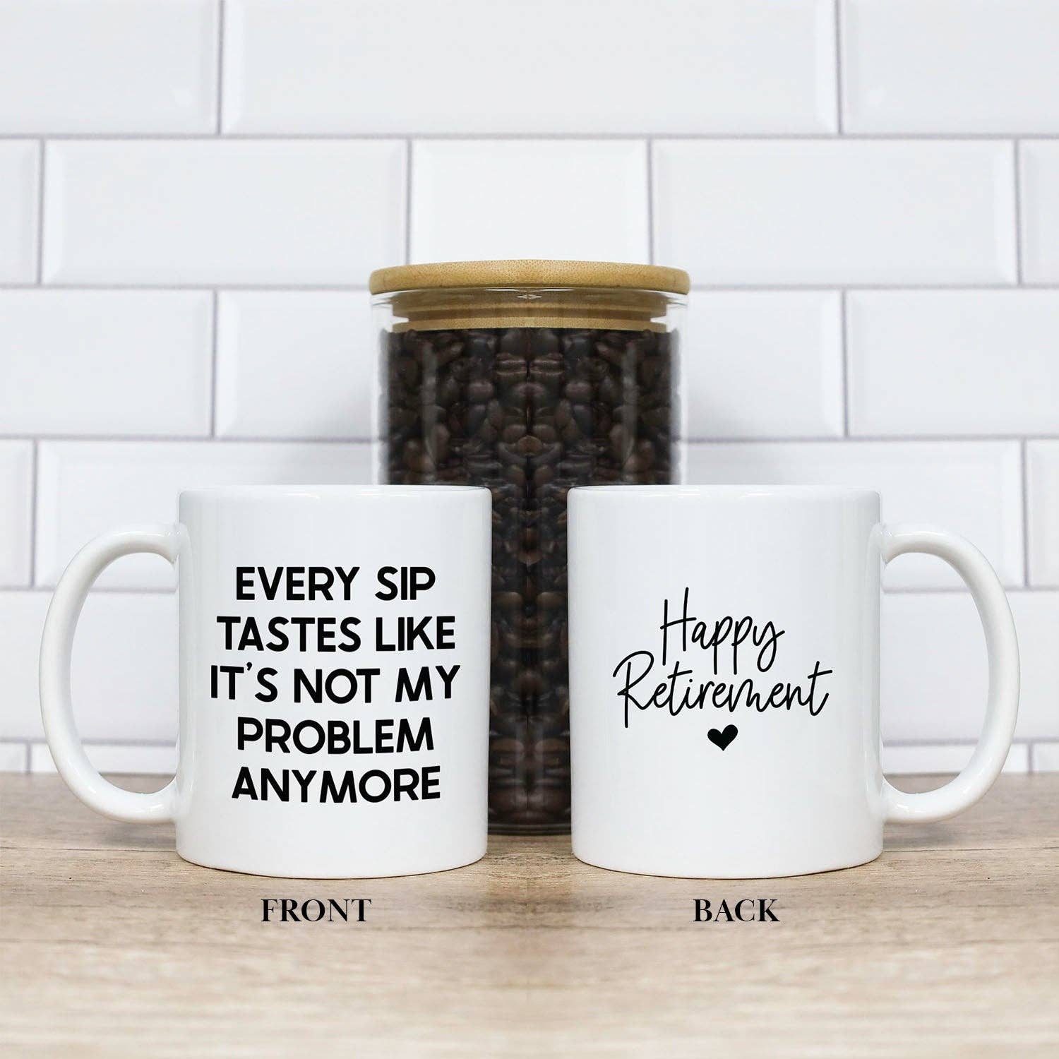 Front Every Sip Tastes Like It's Not My Problem Anymore Back Happy Retirement Details: * Printed on both Sides of Mug. * Designed and Printed in the USA * Printed with Quality Inks that are Baked into the Ceramic and will not Peel or Fade. * Carefully packaged in a durable gift box so it will arrive safely. Care: * Dishwasher and Microwave Safe! * Wash Before Use and Avoid Abrasive Cloths When Cleaning * Use Caution When Removing from Microwave Item #M-1985-11, M-1985-15
