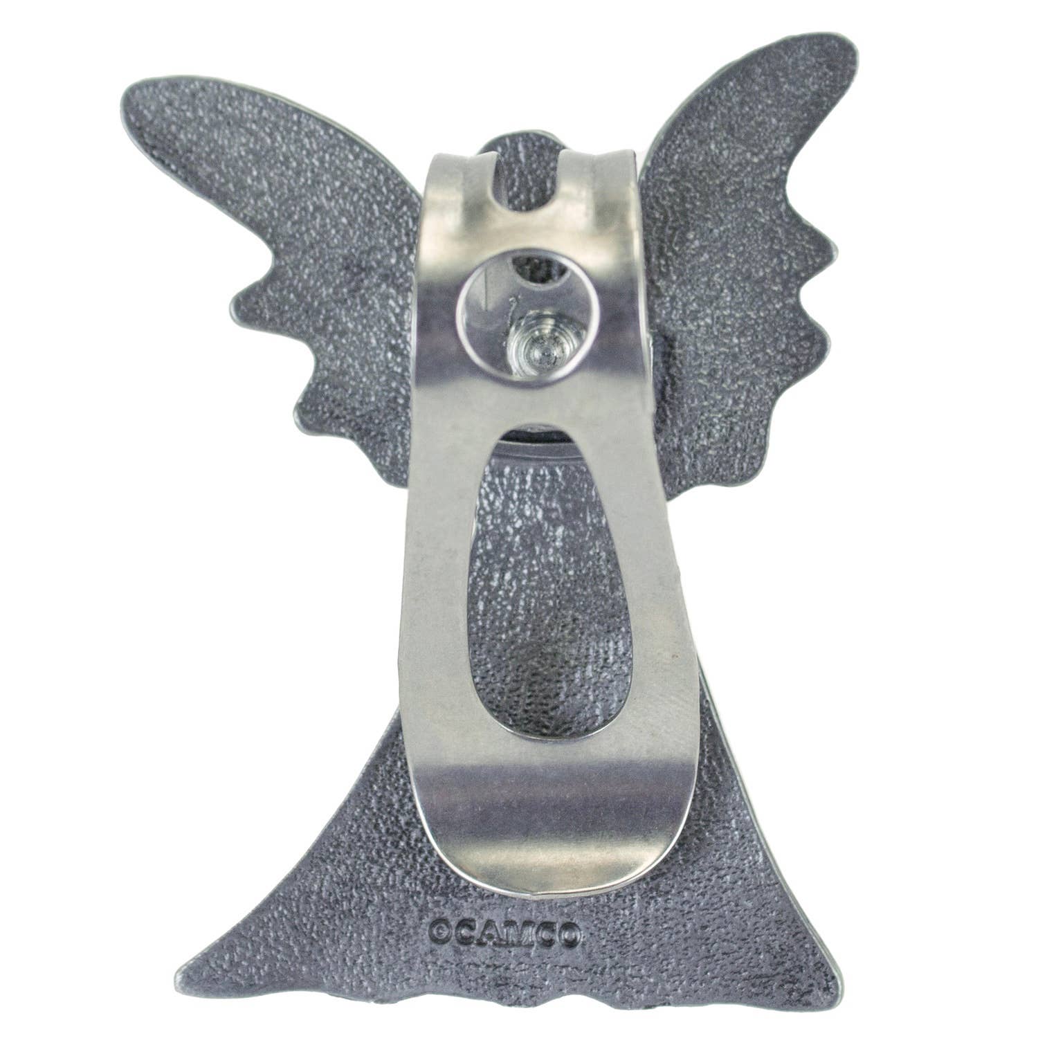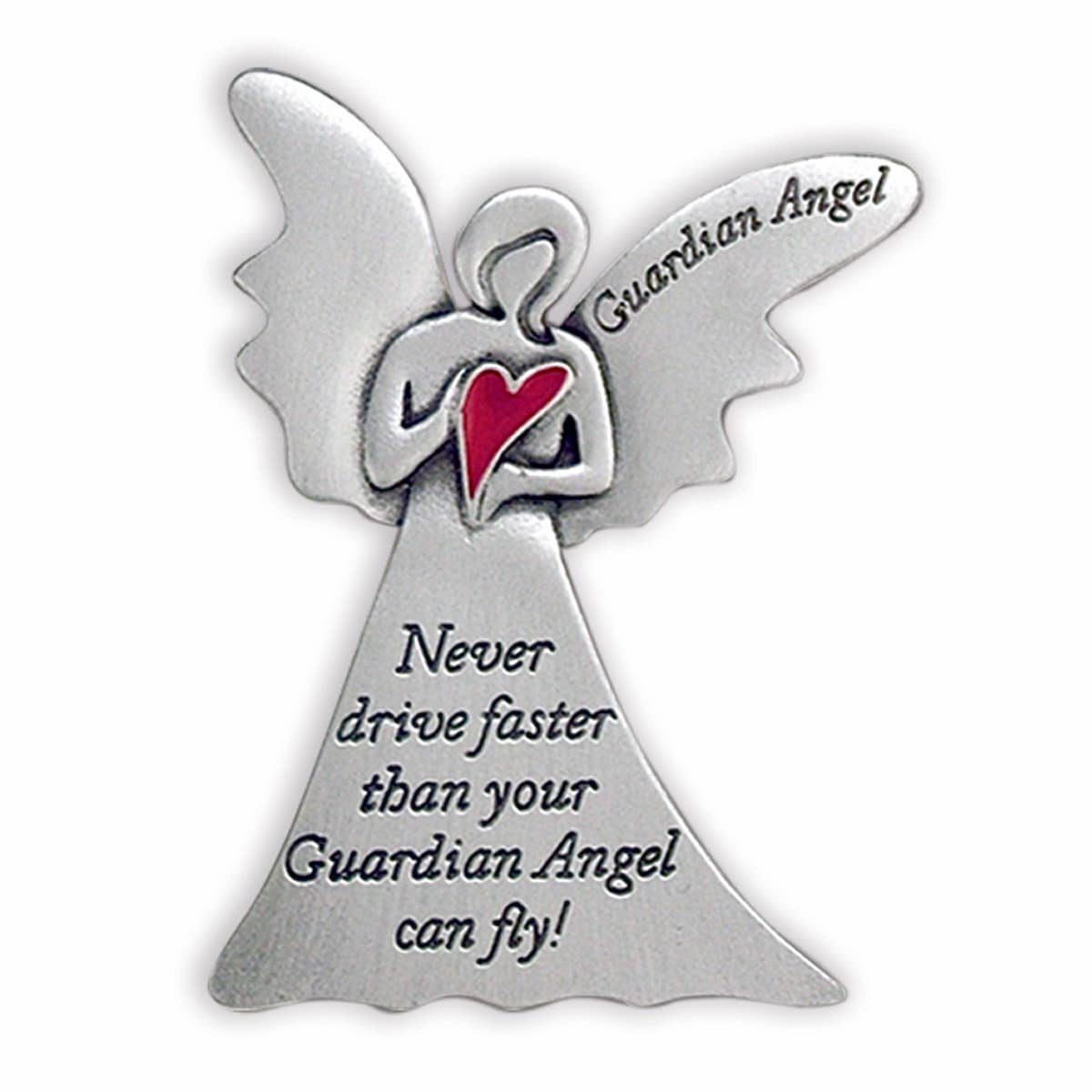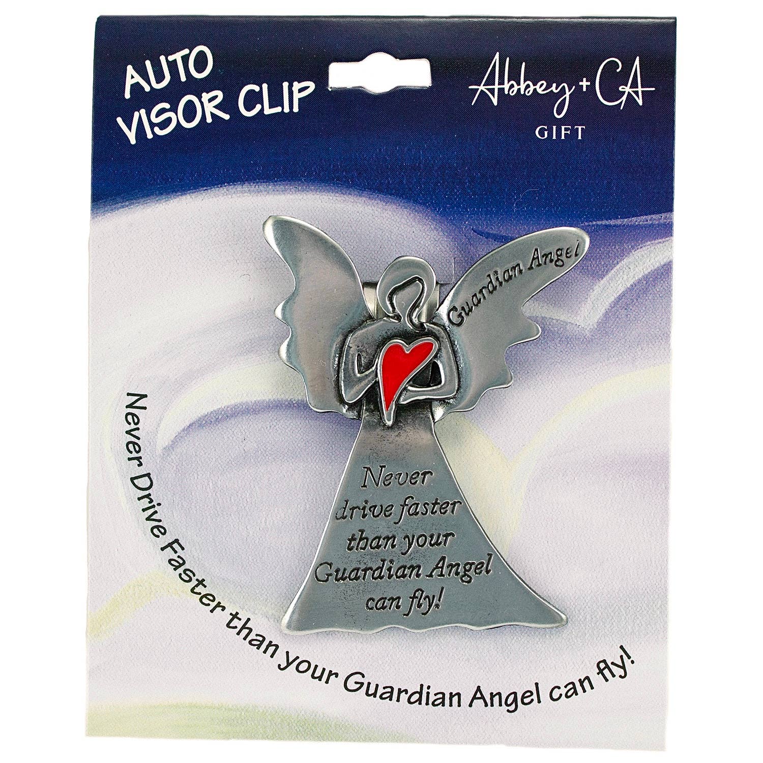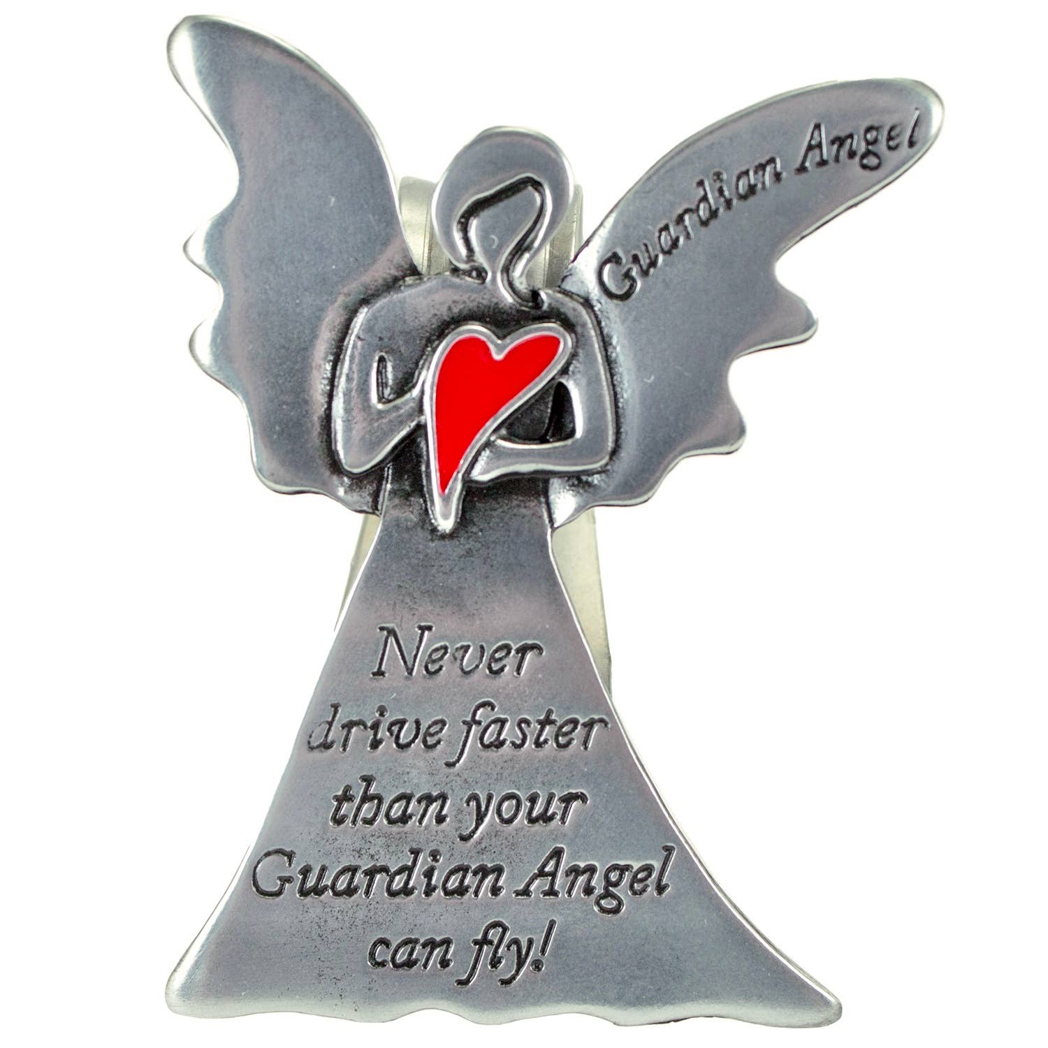 Guardian angel auto visor clip w/silver enamel finish & red heart, "never drive faster than your….", Carded.
