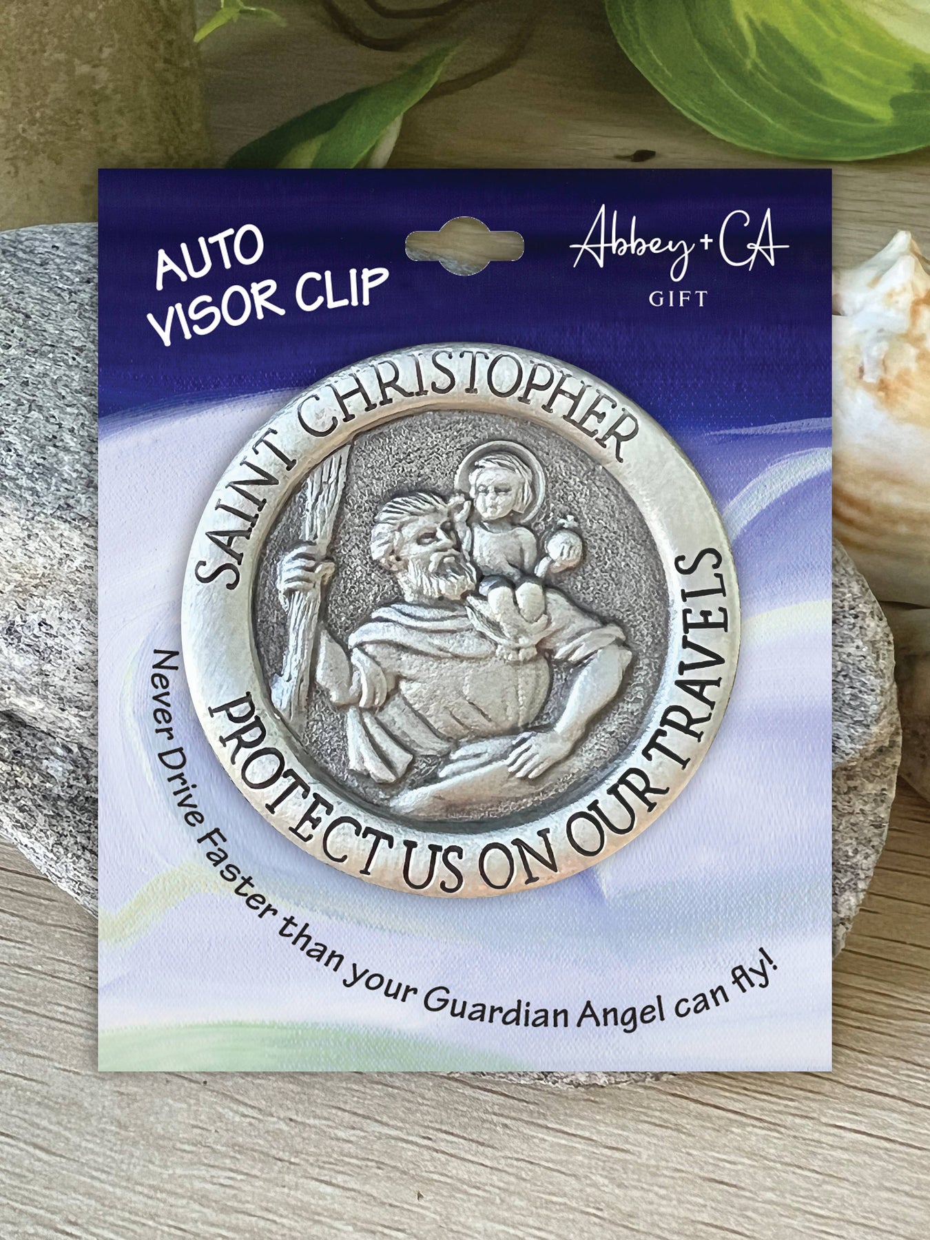 Auto visor clip in bright silver enamel finish, Saint Christopher design with border. “Saint Christopher protect us on our travels" message. Carded.