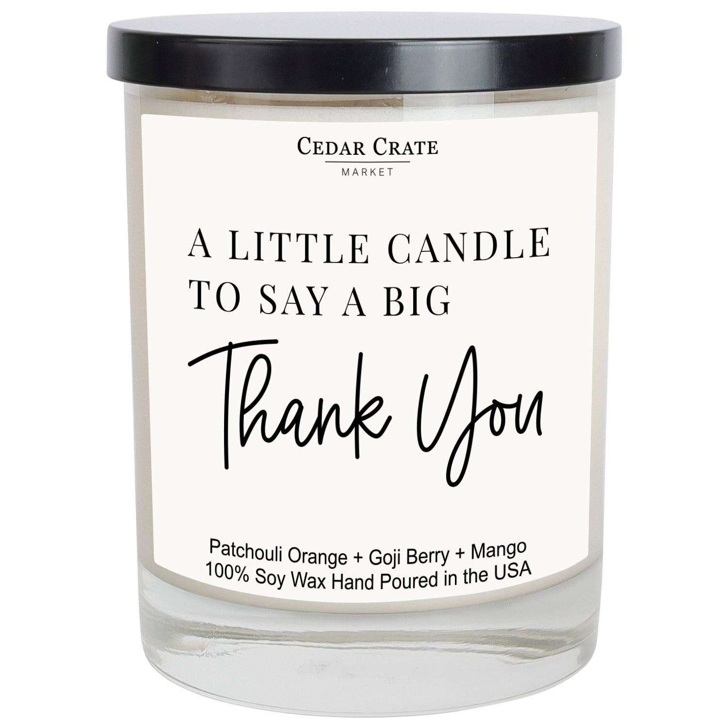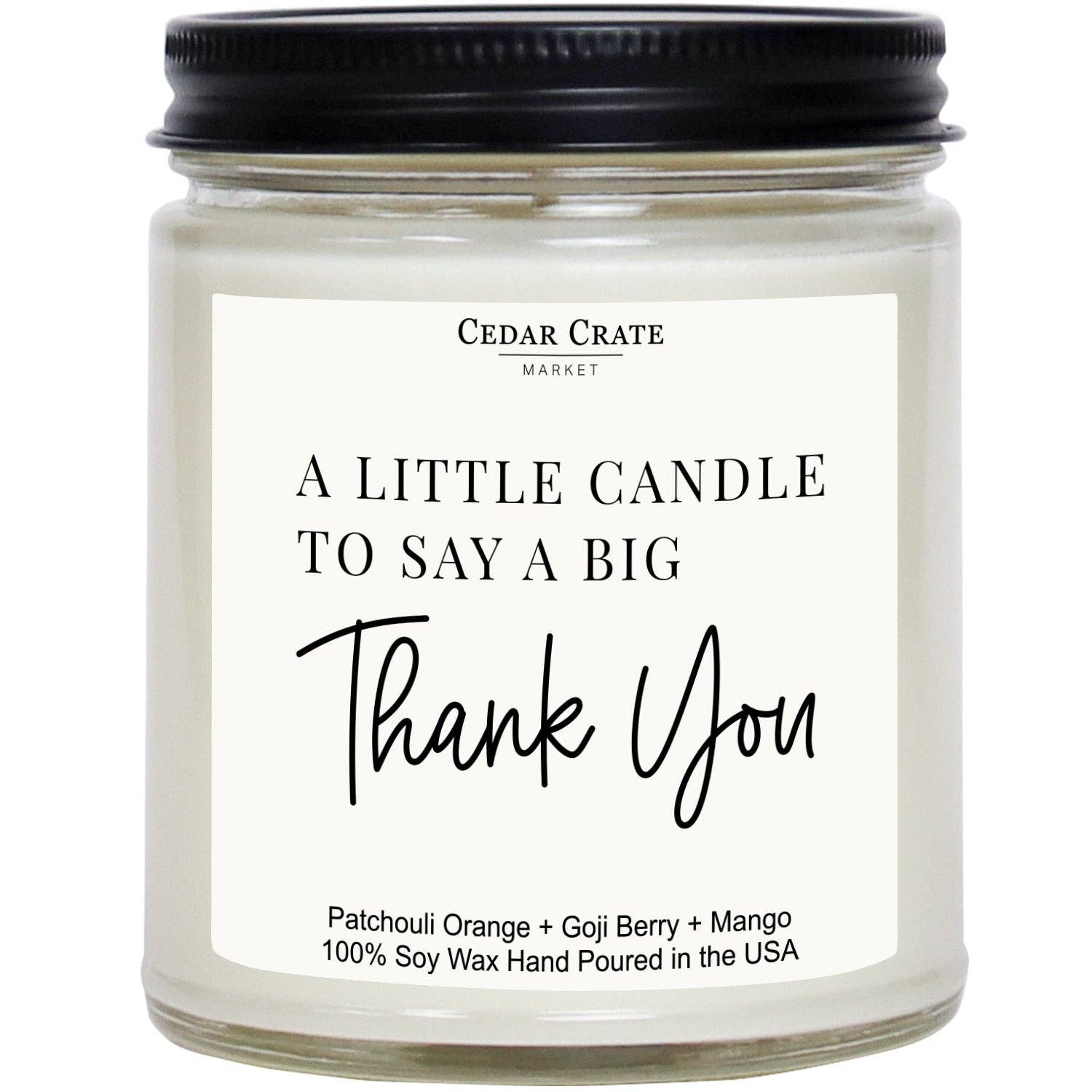 A Little Candle To Say A Big Thank You SCENT: #4 Patchouli Orange. The aromatic scent of ripe oranges and patchouli will fill your home with notes of Goji Berry and ripe mango. NOTES: Top: Orange Middle: Mango Bottom: Goji Berry * Size: 9 oz Jar | 2.75 x 2.75 x 3.5" 50+ Hours * Size: 13.5 oz Jar | 3.5 x 3.5 x 4" 60+ Hours 100% Soy Wax, Essential and Premium Fragrance Oils, Cotton Wick, Reusable Jar. Phthalate Free, Non-Toxic, Cruelty Free, Vegan, Non-GMO. Hand Poured in Minnetonka, MN, Made in USA Unique Gifts Like Sassy Candles, Funny Candles With Funny Quotes and Cool Candles With Unique Designs Add a Touch of Fun and Attitude to Your Fall Home Decor and Are a Great Present for Family and Friends. Novelty Gifts Like Scented Candles Are the Perfect Hostess Gift, Girlfriend Gift, Bridal Gift, Nurse Gift, Teacher Gift, Mom Gift, Christmas Gift, Birthday Gift, Sentimental Gift, Romantic Gift, New Home Gift, Thank You Gift, College Gift, Valentine Gift or Mother’s Day 1722-4
