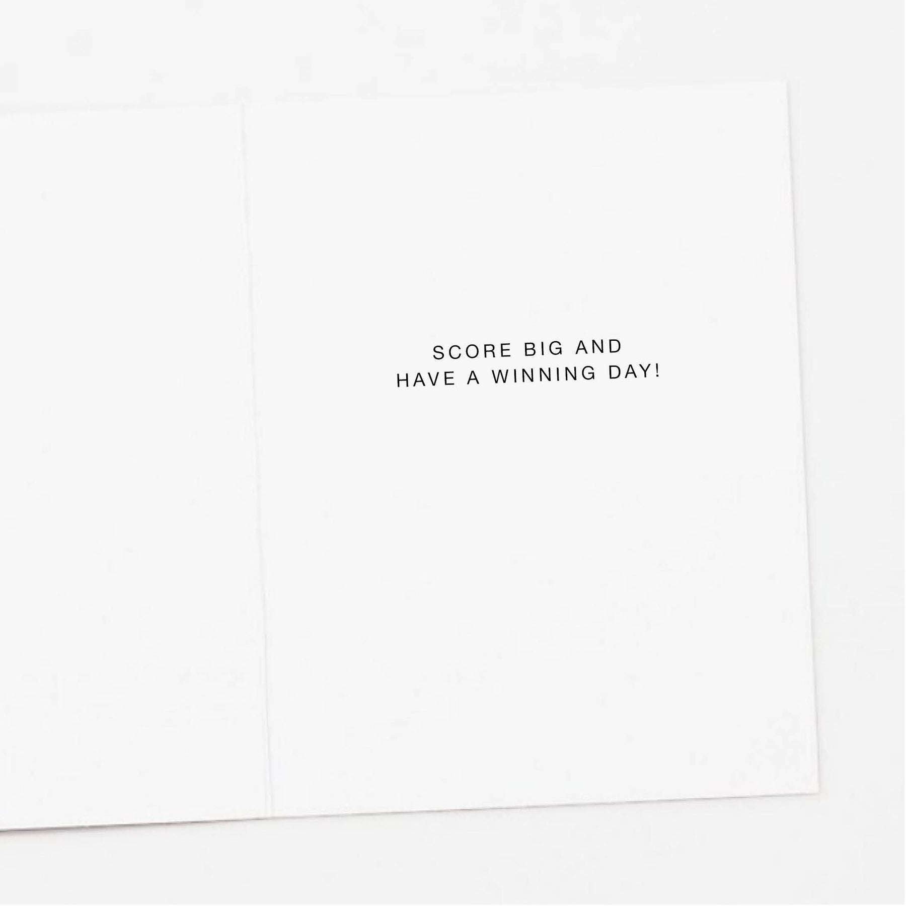 A2 Size Greeting Cards (4.25 x 5.5 inches folded). Inside greeting: "SCORE BIG AND HAVE A WINNING DAY!" Printed on premium recycled paper. Paired with recycled brown kraft envelopes. Packaged in cello.