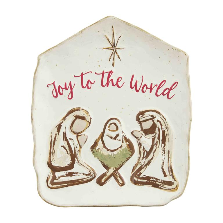 Hand-painted stoneware platter featuring a charming nativity scene that brings festive cheer to your holiday table. Each piece is uniquely crafted with vibrant glazes and thoughtful details, making it a one-of-a-kind addition to your seasonal décor. Perfect for serving appetizers, displaying holiday treats, or standing alone as a conversation-starting centerpiece. The durable stoneware construction ensures this cheerful platter will be a treasured part of your celebrations for years to come. Whether you're hosting a gathering or looking for a meaningful gift, this nativity platter spreads joy and warmth throughout the season.
