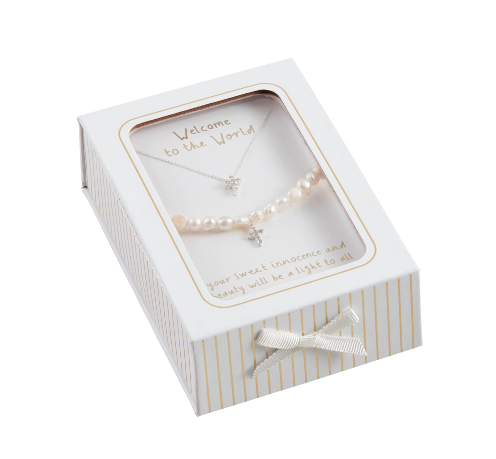 Mark this milestone moment with a magical 2-piece set crafted just for your little one! This charming boxed collection brings together a pearl bead bracelet adorned with a tiny pave cross charm and a matching pave cross necklace on a delicate chain. Designed to celebrate new beginnings, this coordinated pair sparkles with understated elegance and heartfelt meaning. It's the perfect keepsake gift to welcome a precious child into the world with style, grace, and a touch of sparkle.