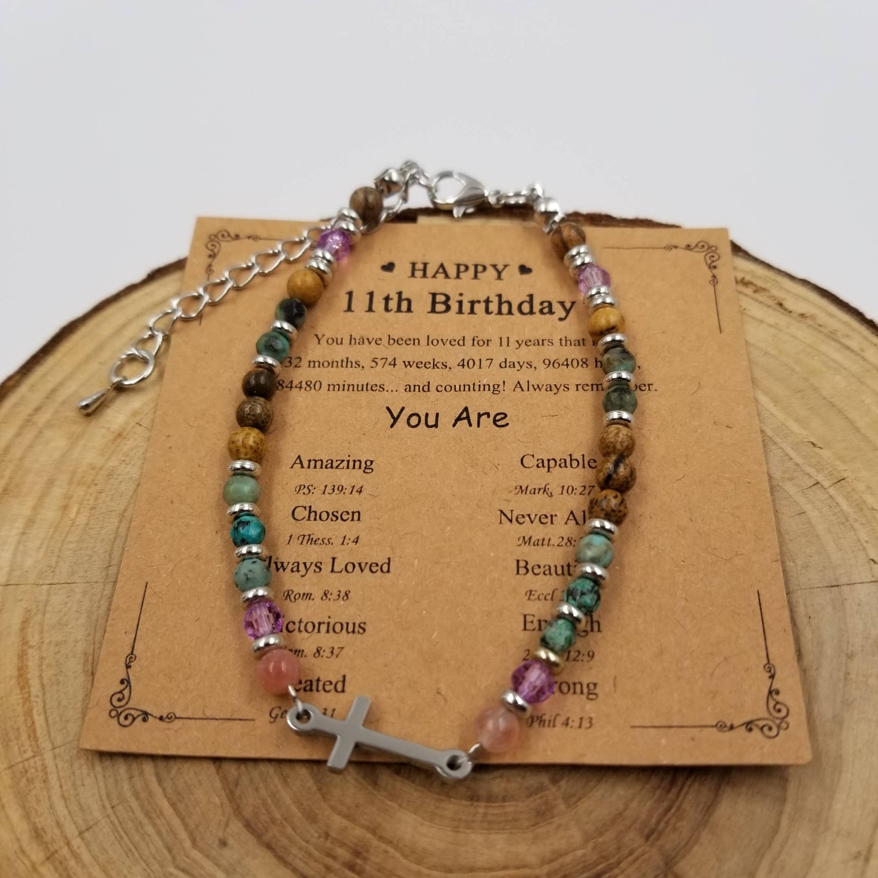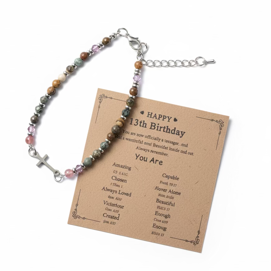 Mark this pivotal birthday with a gift that carries meaning. This bracelet showcases authentic African turquoise beads anchored by an elegant cross charm—a symbol of strength and guidance as they step into their teenage years. Paired with a premium greeting card, it arrives ready to present. The natural stone's calming blue-green hues work with any aesthetic, while the cross pendant serves as a daily reminder of resilience and purpose. A timeless accessory that transforms a birthday into a moment of intention.
