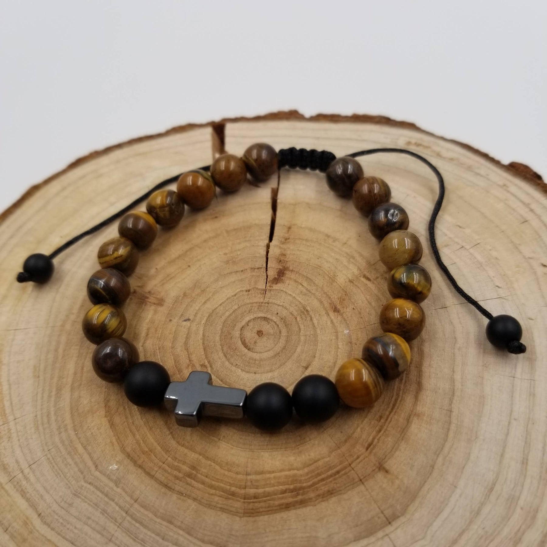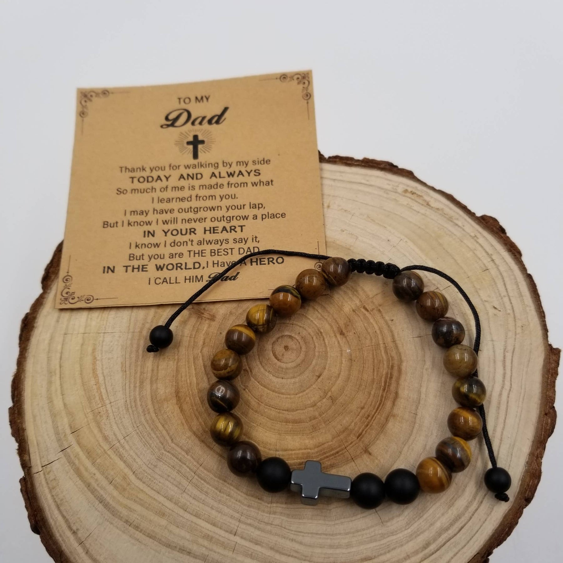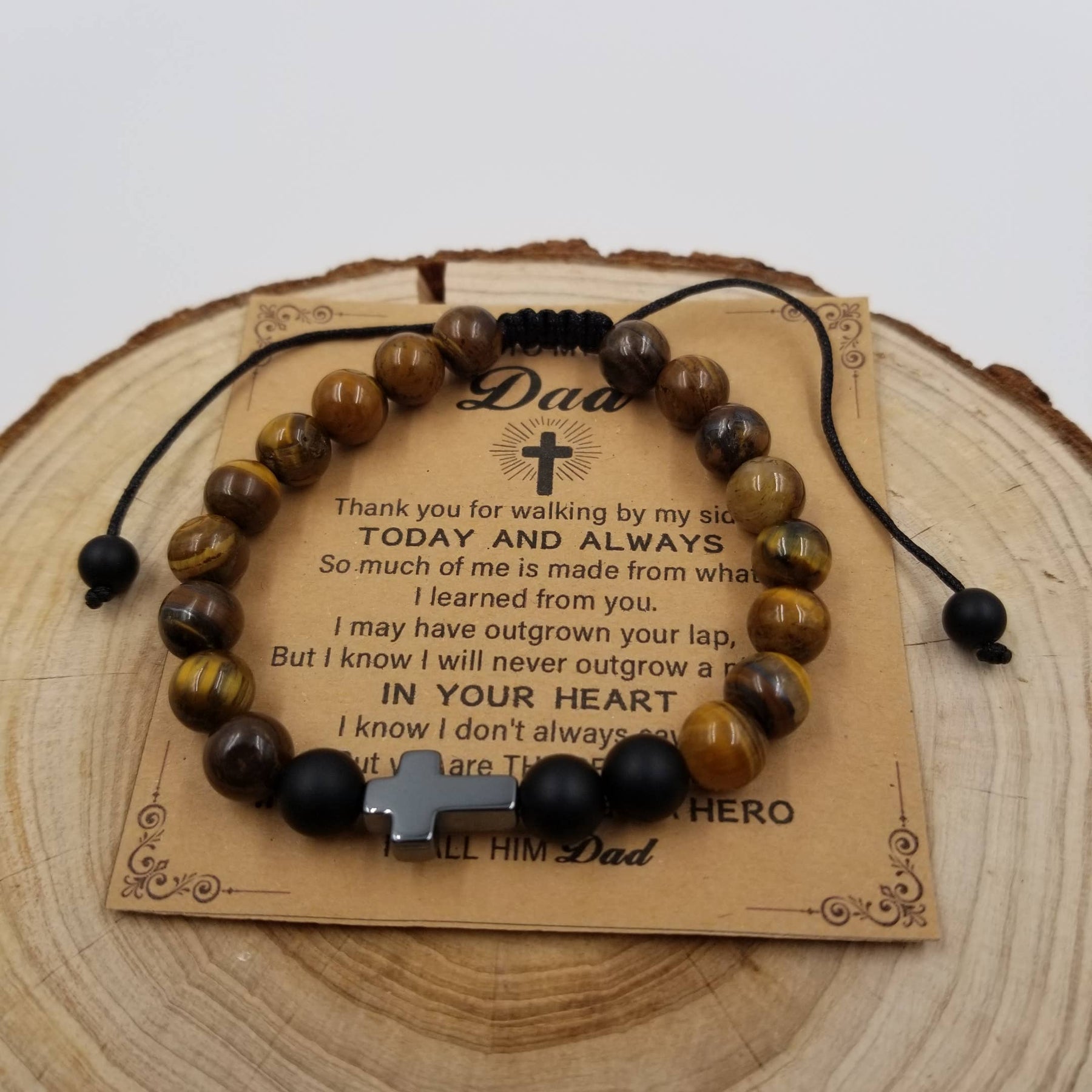 Give dad a bracelet as meaningful as he is. Crafted from natural tiger eye stone beads with a symbolic cross detail, this piece combines spiritual significance with understated sophistication. The warm, honeyed tones and distinctive grain of tiger eye create a look that's both grounded and refined—ideal for the man who values authenticity and purpose in every choice he makes.