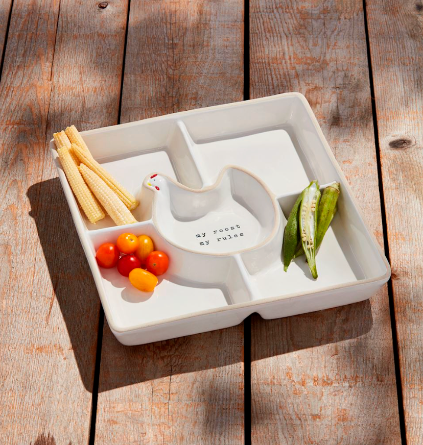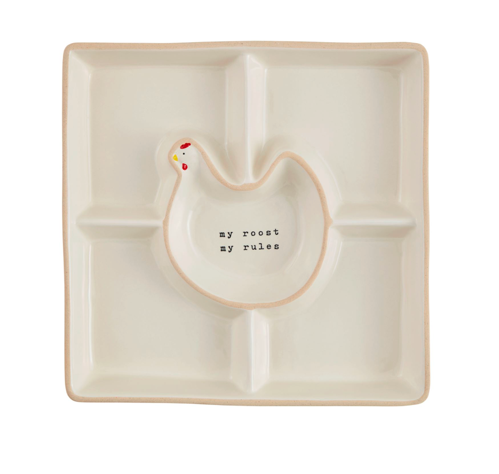 Elevate your entertaining with the "My Roost My Rules" Chicken Divided Platter, expertly hand-painted on durable stoneware. This charming platter features four spacious sections, perfect for serving a variety of appetizers, sides, or snacks, all neatly organized. The attached center dip well adds convenience, keeping your favorite sauces, dips, or dressings within easy reach. Ideal for family gatherings, casual meals, or special occasions, this unique piece blends functionality with farmhouse charm to make serving effortless and stylish. Make every meal memorable with a platter that reflects your personality and love for sharing.