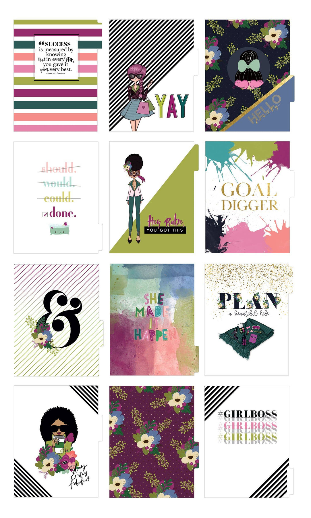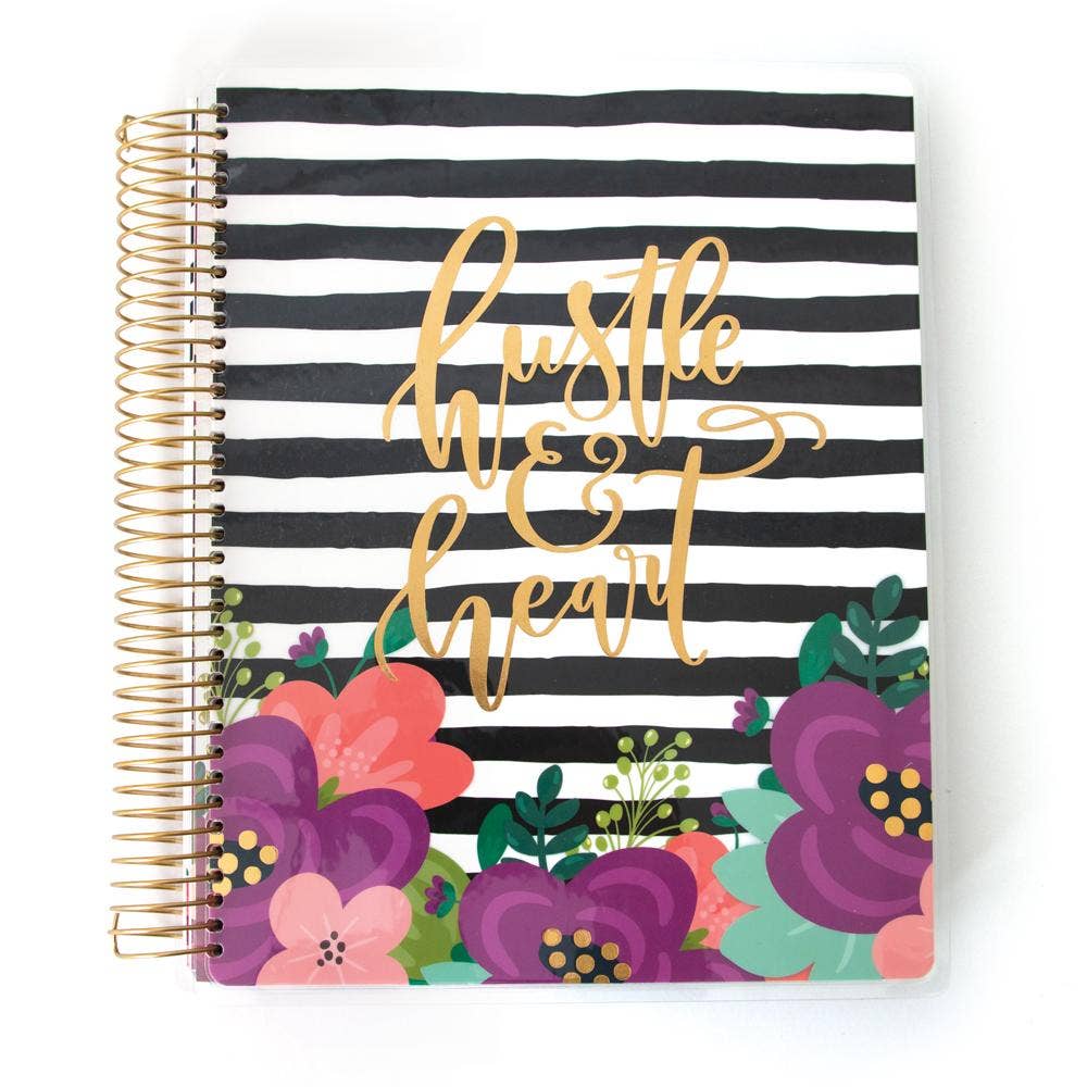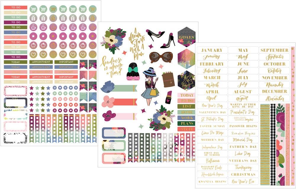 This 12-month undated planner features a durable laminated cover with foil accents. 12 heavyweight dashboards with laminated tabs separate each month. 4 dashboards have foil and 2 have pockets. Includes notes pages, monthly spreads, horizontal weekly spreads, and 140+ fun, coordinating stickers.