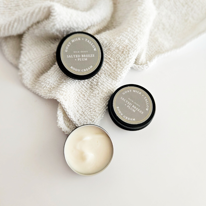 The key ingredients of our body cream include tallow, goat milk, sunflower oil, aloe vera, and vitamin E. We've perfected a formula that delivers quick hydration, a potent dose of essential vitamins, minerals, and proteins, and slow-release, long-lasting moisturization. The lighter ingredients are designed to soak in quickly to provide instant relief while the heavier ones settle more slowly forming a powdery dry, protective barrier.