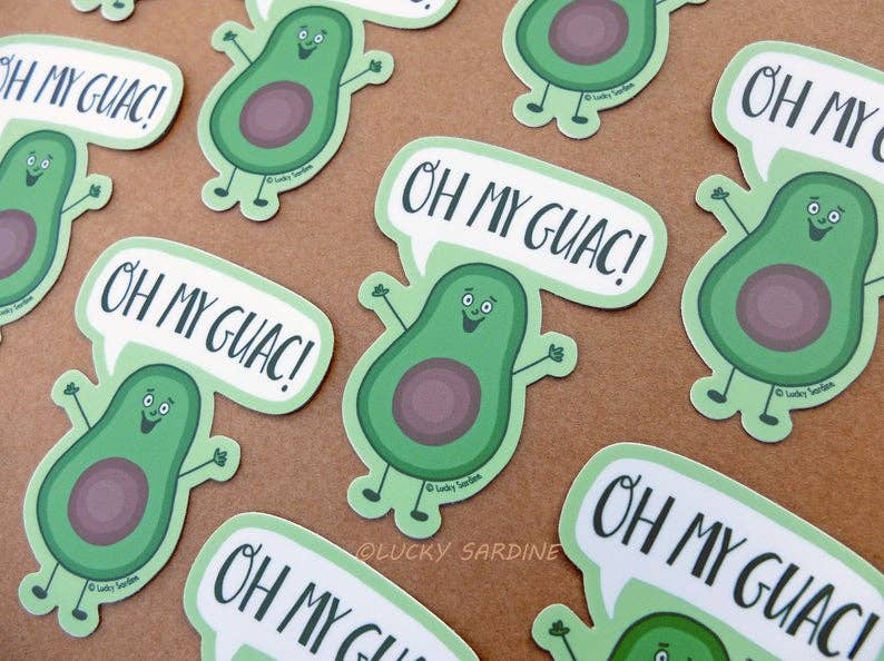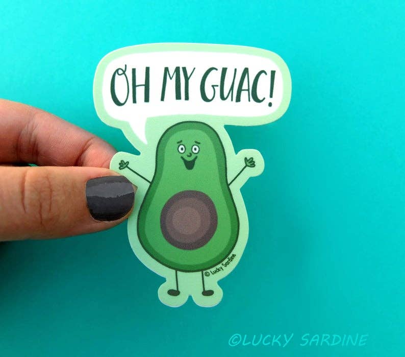 Funny, OMG avocado vinyl sticker! *Approximately 3.12" x 2.37" *Printed on water-resistant, coated vinyl. *Thick, durable vinyl with a UV laminate. *Weatherproof, waterproof, and scratch-resistant. *Dishwasher safe. *Lovingly designed at our studio in South Carolina.