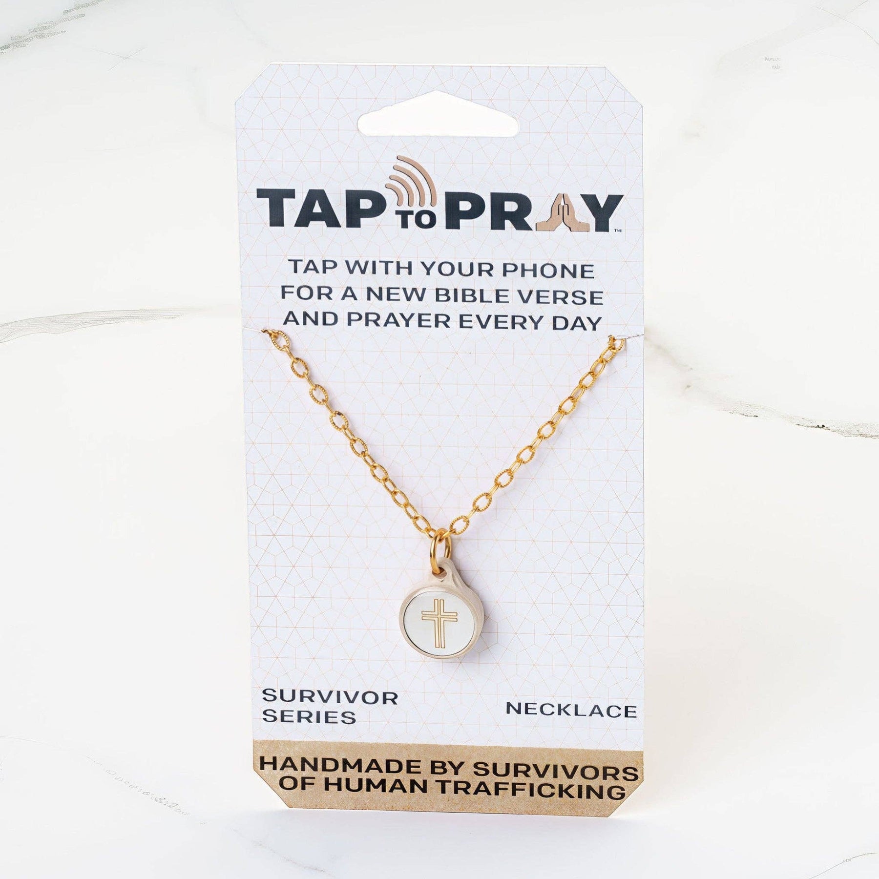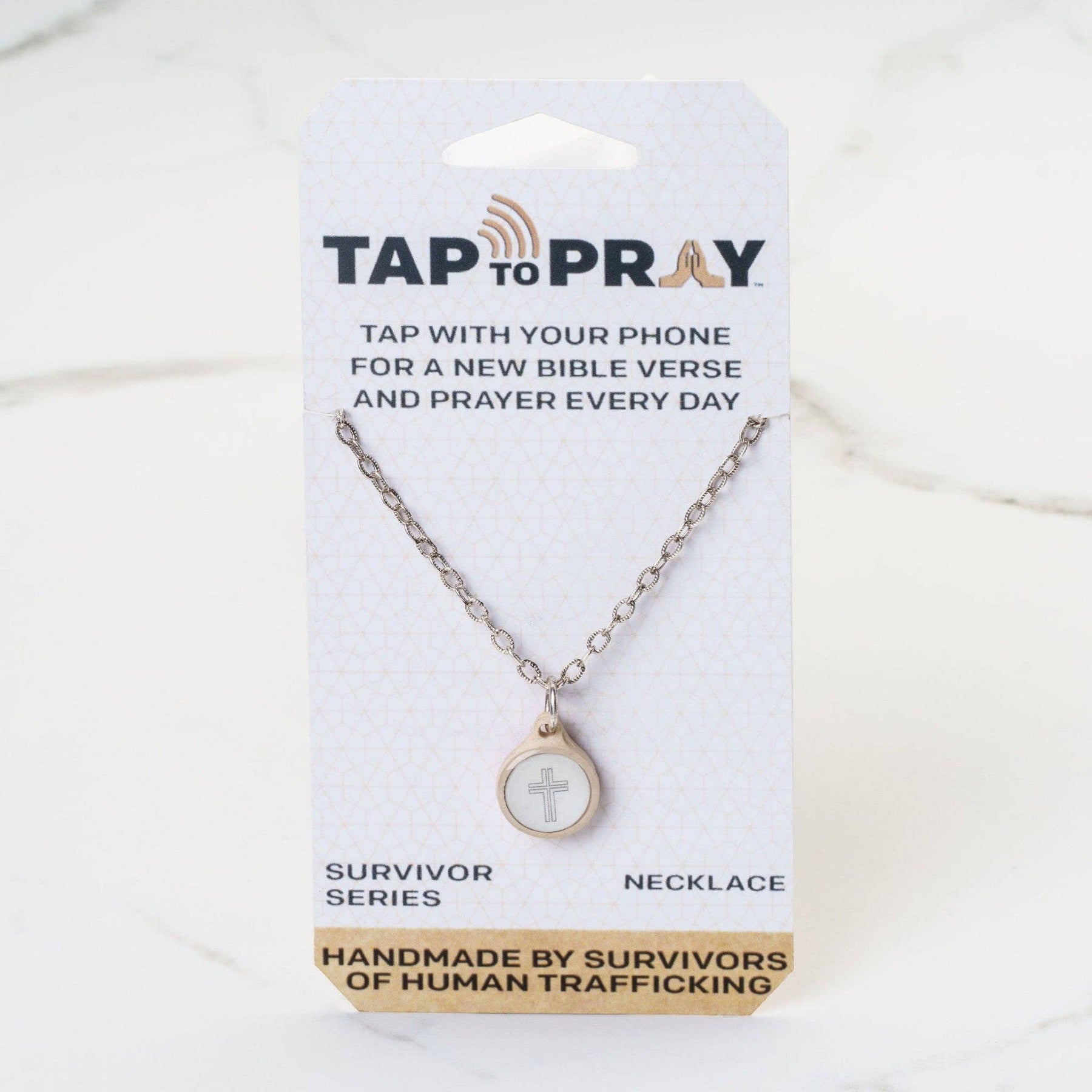 Tap To Pray® introduces our new line of Survivor Series handmade necklaces. Each adjustable 18" necklace is crafted by a survivor of human trafficking in the Dominican Republic and features a Tap To Pray® necklace charm. At the center of each clay charm is an NFC chip that lets you tap with your phone to receive a new Bible verse and prayer every day. No app required—just hold your phone over the tag for a couple of seconds and open the notification. Tap To Pray® works with most smartphones. Each purchase helps support the Tap To Pray® mission to fight human trafficking.