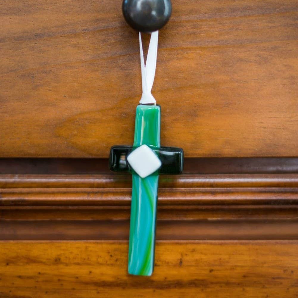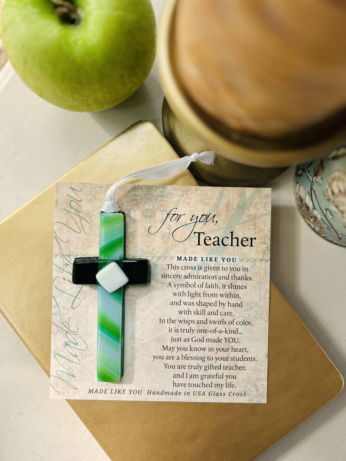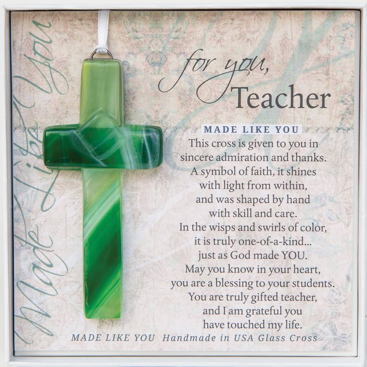 A unique Christian gift for a teacher who has always been there for a child. Our 4" glass cross is lovingly handmade in the USA. Each teacher's cross will be a beautiful shade of green, however, it will be unique in the swirls and colors created by the firing of the glass. The cross hangs from a white satin ribbon, perfect for display anytime of year and any place... a rear view mirror, window, drawer knob, bible page marker, ornament stand, or Christmas tree. Your teacher will love the message this gift of faith sends...You are uniquely created. Gift-boxed in white 5.5x5.5 clear top box with Made Like You sentiment and art. A wonderful Teacher Appreciation gift, teacher thank you gift or end of year gift for a teacher.