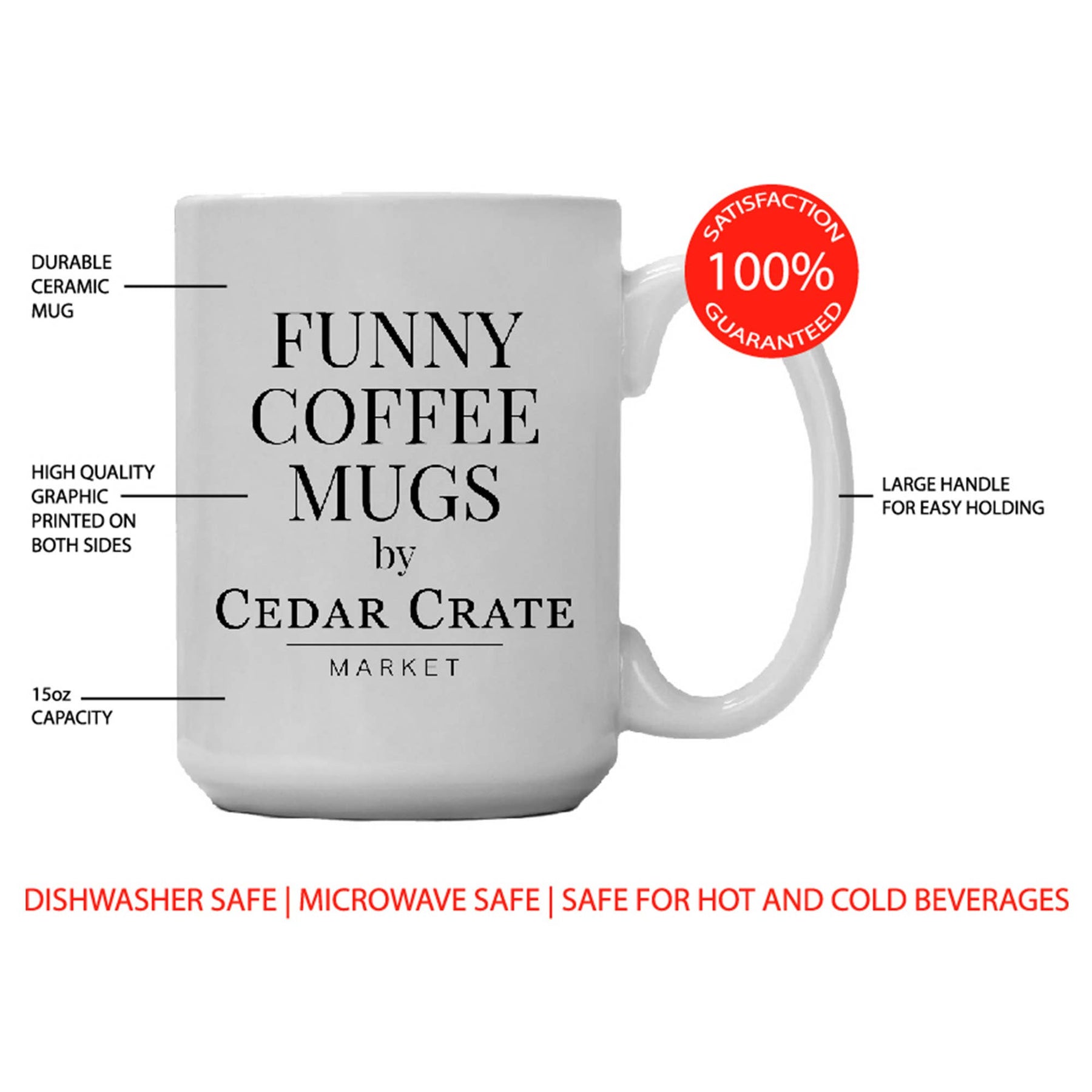 Cedar Crate Market is proud to present this 15 oz. Coffee mug in its own gift box. Featuring clever sayings and designs by our in-house design staff. This 15-ounce mug is made of premium quality ceramic and has a shiny white glaze finish baked on. The printing is baked into the mug and will not fade, chip, or rub off. And best of all it is microwave and dishwasher safe. Guaranteed! We carefully wrap each mug in soft bubble wrap to ensure it arrives to you safely. The perfect present for her, BFF, Best Friend, girlfriend, boyfriend, teacher, nurse, Doctor, neighbors, male or female, boss, lawyer, coach, couples, family, bride, groom, mom, dad, husband, wife, brother, sister, daughter, son, cousin, aunt, grandparents, grandpa, grandma, grandson, or granddaughter. This mug provides plenty of laughter, conversation, encouragement, and friendship. Our drinkware and novelties are sure to bring cheer. This is not one of those smaller 11 ounce promotional mugs, it is a huge 15 ounce mug.