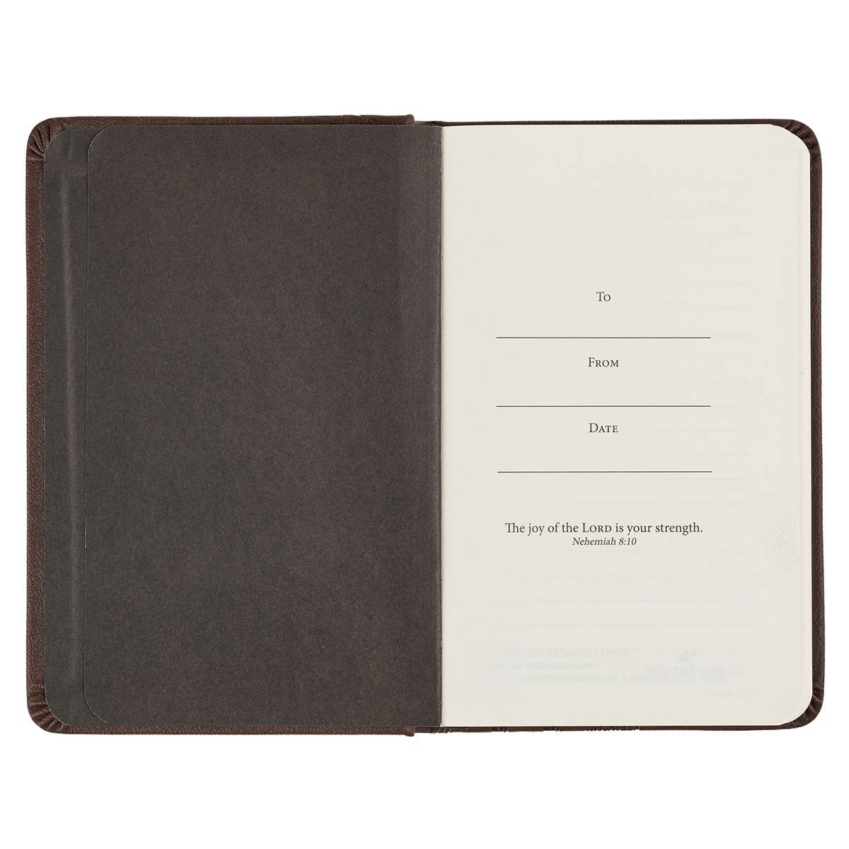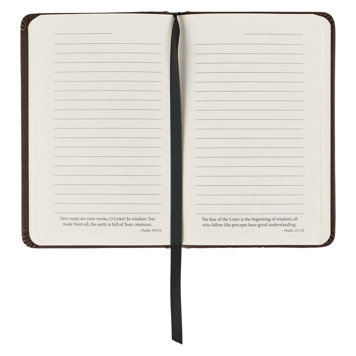 Heat-debossed lion silhouette design, Walnut-brown faux leather, Heat-debossed sentiment, "The Lord is my strength and my defense; He has become my salvation, Exodus 15:2", Strength and Defense Walnut-Brown Lion Collection, Hardcover, Black elastic band closure, Nifty small pocket size, 192 lined pages, Cream-colored pages, Acid-free pages, Attached ribbon marker, Presentation page, Size: 5.8" x 3.8" x 0.7"