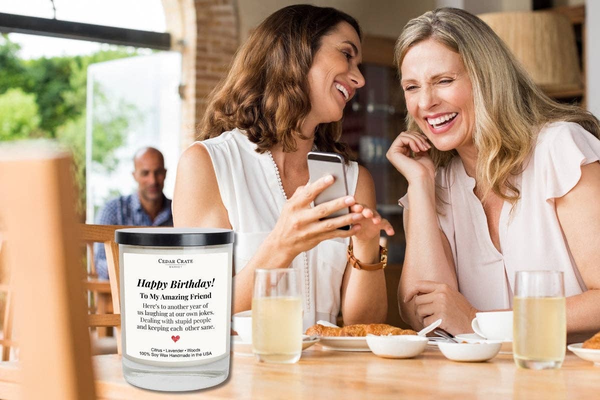 Happy Birthday To My Amazing Friend Here's to another year of us laughing at our own jokes. Dealing with stupid people and keeping each other sane. SCENT: # 8 Lavender + Lemongrass. Bright and flavorful this scent will fill your home with notes of lemon, orange, lavender, lily, woods, and musk. NOTES: Top: Orange, Lemon, Middle: Lavender, Lily, Bottom: Woody, Musk Size: 9 oz Jar | 2.75 x 2.75 x 3.5" 50+ Hours Size: 13.5 oz Jar | 3.5 x 3.5 x 4" 60+ Hours 100% Soy Wax, Essential and Premium Fragrance Oils, Cotton Wick, Reusable Jar. Phthalate Free, Non-Toxic, Cruelty Free, Vegan, Non-GMO. Hand Poured in Minnetonka, MN, Made in USA Unique Gifts Like Sassy Candles, Funny Candles With Funny Quotes and Cool Candles With Unique Designs Add a Touch of Attitude to Your Fall Home Decor. Novelty Gifts Like Scented Candles Are the Perfect Hostess Gift, Girlfriend Gift, Bridal Gift, Nurse Gift, Teacher Gift, Mom Gift, Christmas Gift, Birthday Gift, Sentimental Gift, Romantic Gift, New Home Gift, Thank You Gif