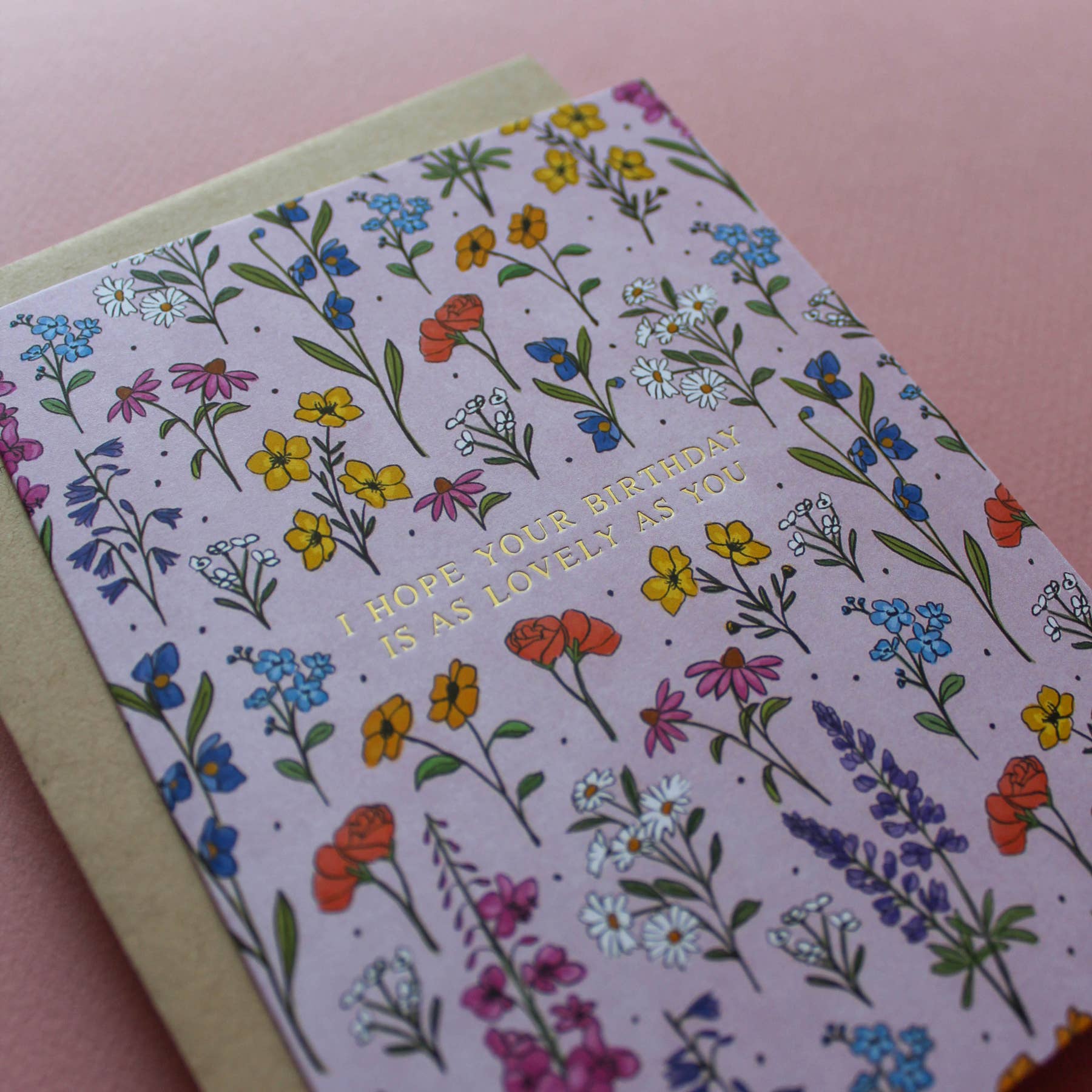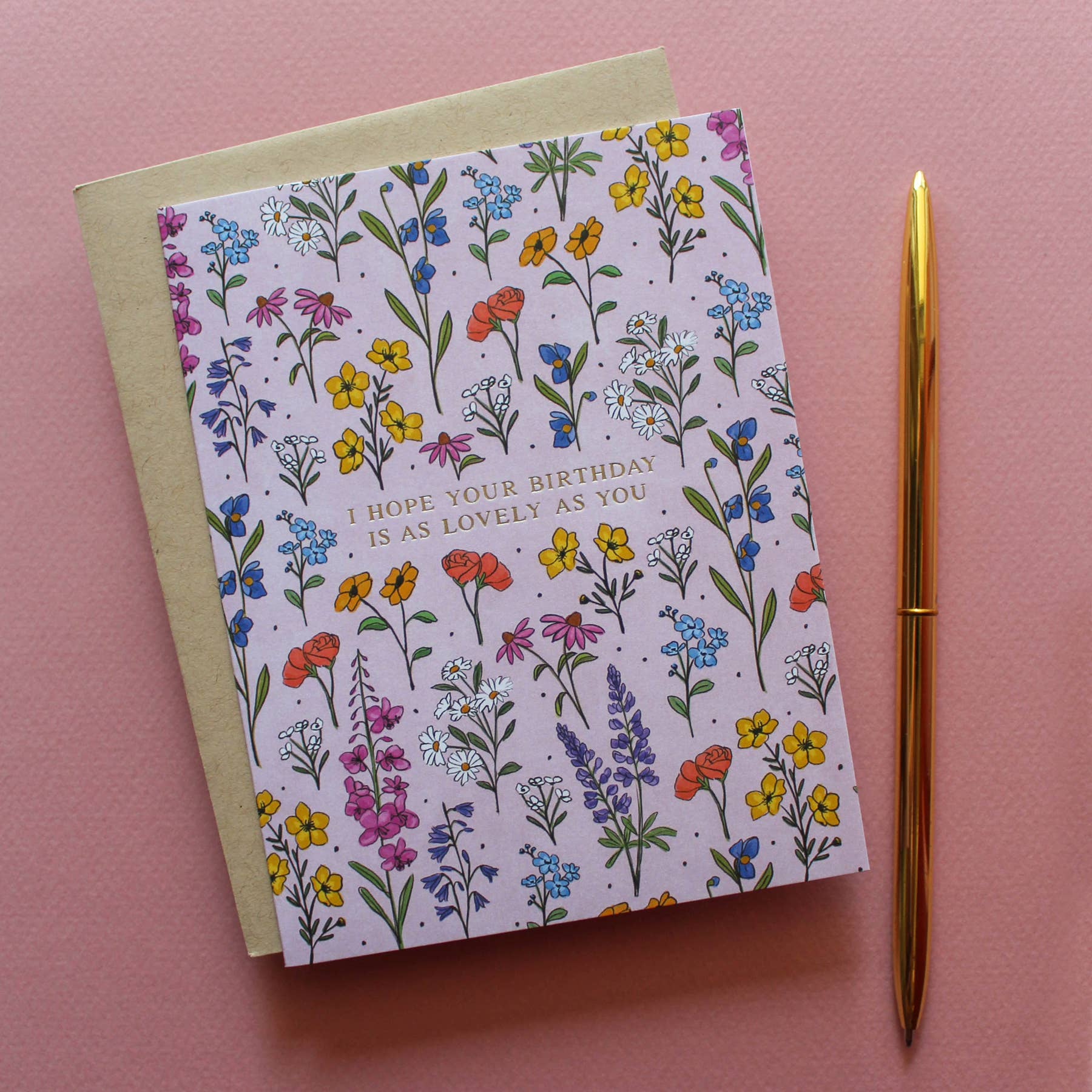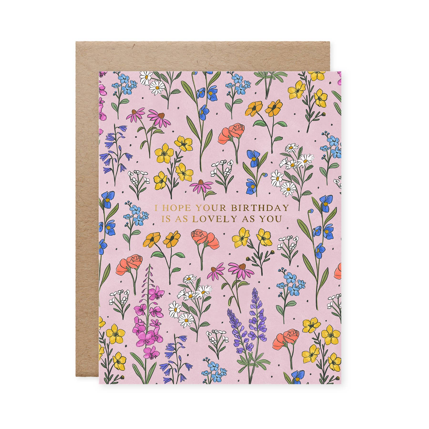 With hand drawn wildflowers surrounding a heartfelt message in gold foil, this card is full of lovely details that will make anyone feel both loved and lovely as they open this birthday card. Details: • kraft envelope • A2 (4.25x5.5inches) • blank inside