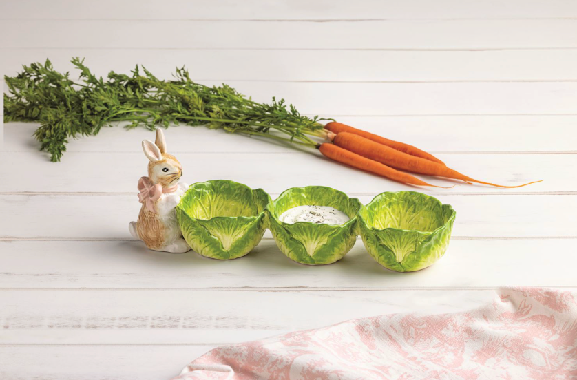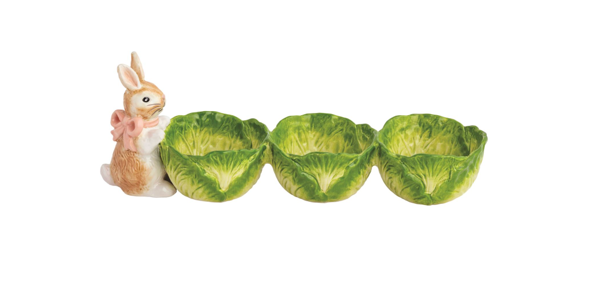 Serve snacks, appetizers, or desserts in style with this whimsical triple tidbit dish. Hand-painted stoneware features a charming cabbage design with a dimensional bunny accent that brings playful character to any table. At 5 1/4" x 12 3/4", it's generously sized for entertaining or everyday use. The vibrant colors and thoughtful detailing make it equally at home at casual gatherings or special occasions—a piece that celebrates both practicality and artistic craftsmanship.