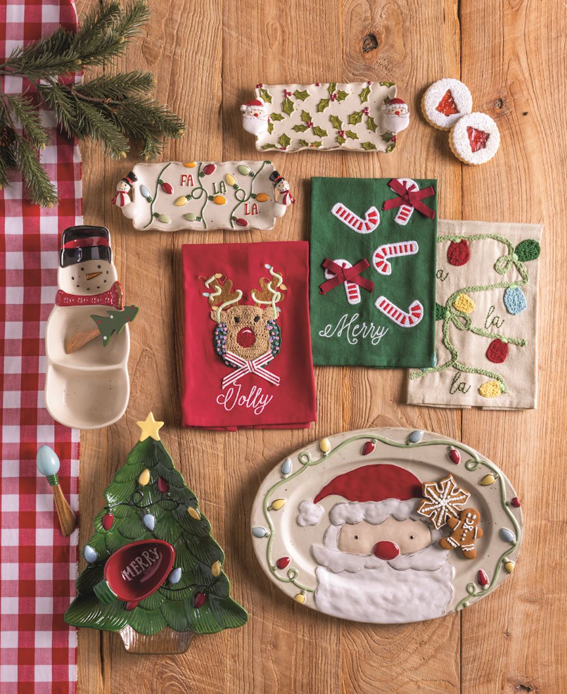 Hand-painted speckle stoneware tray features whimsical figural Santa handles that bring festive charm to your holiday table. Perfect for serving appetizers, cookies, or treats during seasonal gatherings, this charming piece doubles as a delightful decorative accent. The textured stoneware finish adds rustic appeal. Whether you're hosting a merry celebration or looking for a unique gift, this festive dish captures the spirit of the season with playful personality and practical style.