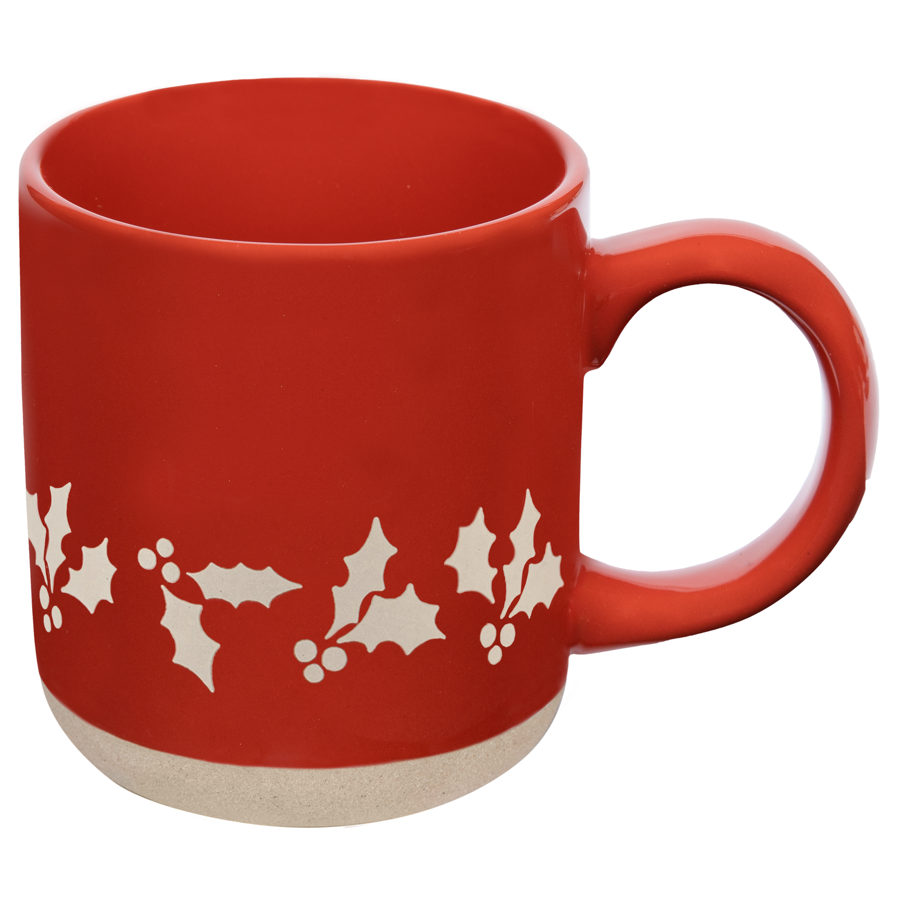 Add festive color to your holiday mugs collection with our red stoneware mug, featuring a classic white holly pattern along the bottom. Perfect for holiday coffee, cocoa, or tea, this timeless coffee mug pairs beautifully with holiday decorations and accessories for a cheerful, seasonal touch your customers will love.