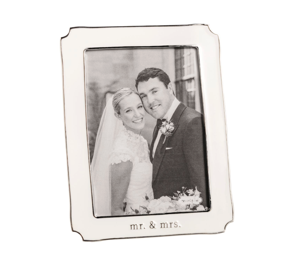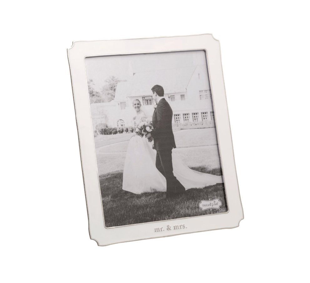 Celebrate love with this elegant enamel-coated metal frame, beautifully inscribed with "Mr. & Mrs." Choose between two sizes: Small (8½" x 6½", holds 5" x 7" photo) or Large (11½" x 9½", holds 8" x 10" photo). Both feature a convenient easel back for easy display on shelves or dressers.